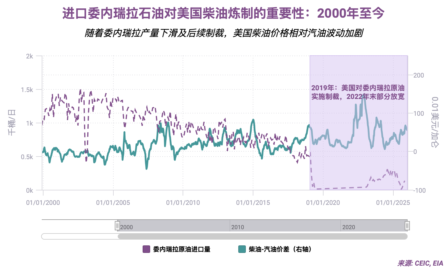 本文绘制了美国柴油与汽油的长期价差走势图,并与委内瑞拉石油进口量进行对比。随着管理不善和产量下滑导致委内瑞拉出口萎缩,美国柴油价格自2000年代中期起持续波动加剧。2019年,特朗普政府首次实施制裁,将美国从委内瑞拉的原油进口量降至微量水平后,这一趋势愈发显著。