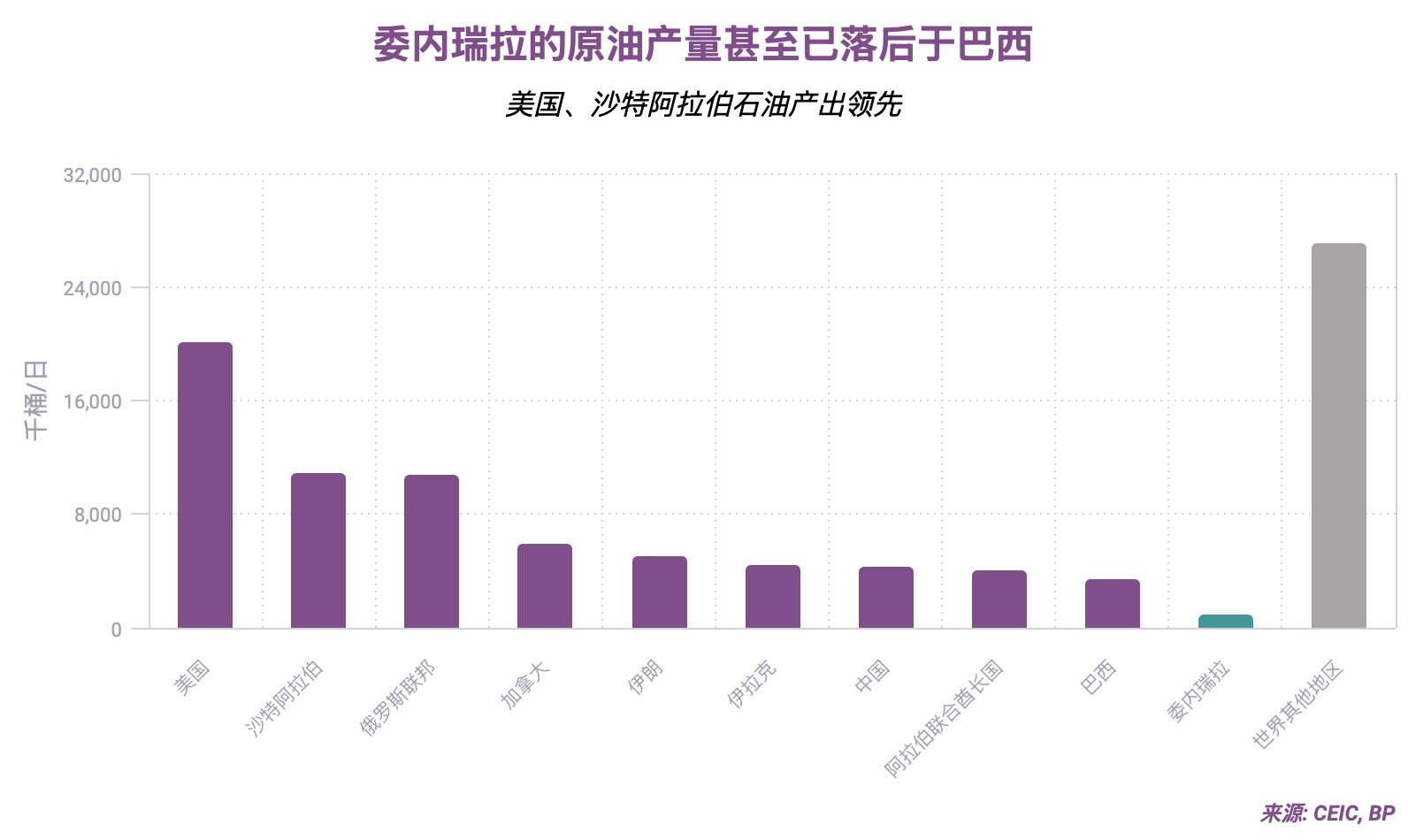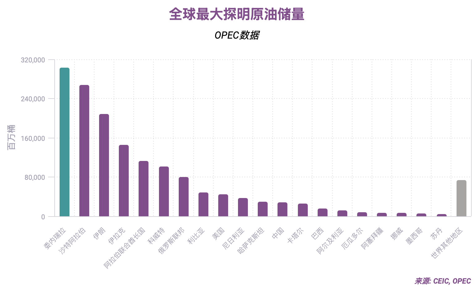 接下来两张图表揭示了委内瑞拉在全球石油格局中的地位。据石油输出国组织(OPEC)数据显示,委内瑞拉拥有超3,000亿桶已探明石油储量(占全球总量的近20%),但其日产量仅徘徊在96万桶左右——不足全球份额的1%,仅相当于1970年委内瑞拉产量的四分之一。
