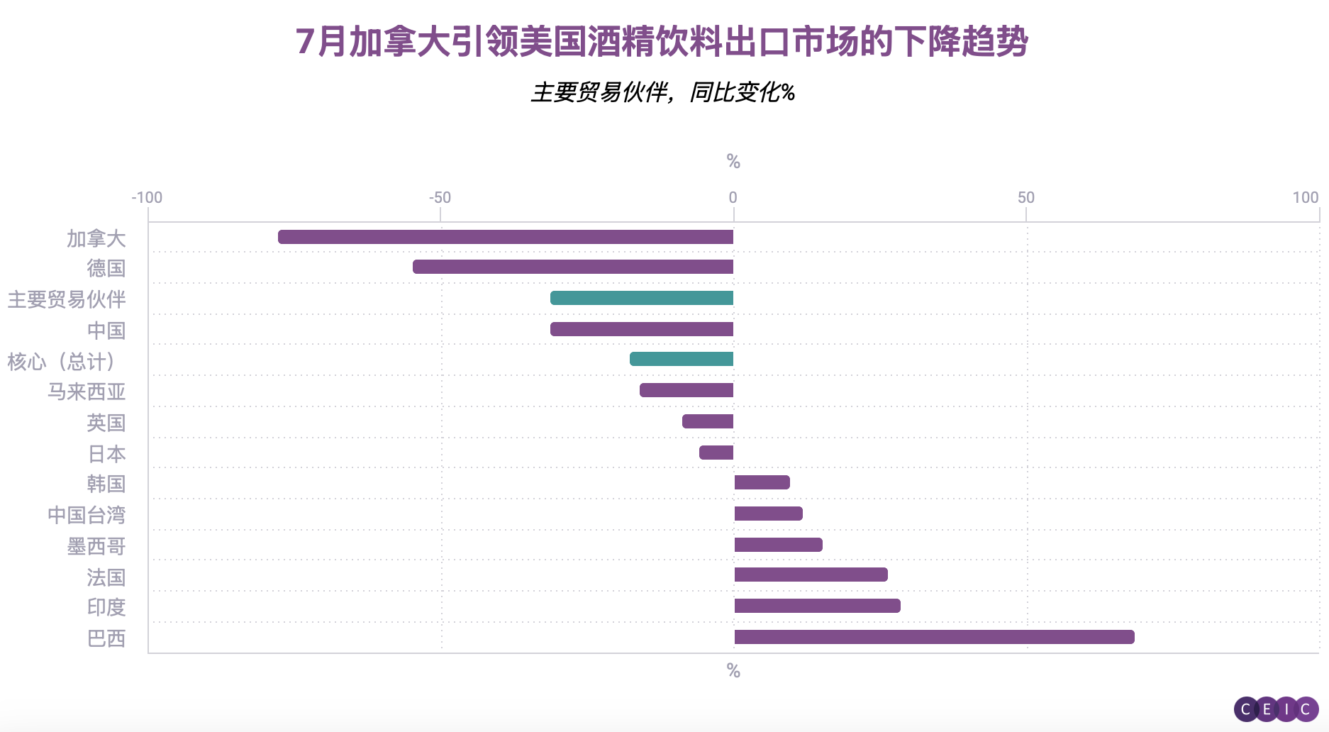本图表显示受打击最严重的是加拿大。安大略省和魁北克省的酒类专卖局已完全停止销售美国酒类,导致7月出口量同比暴跌77.8%(按三个月移动平均值计算)。加拿大此前约占美国该类产品出口总量的五分之一。