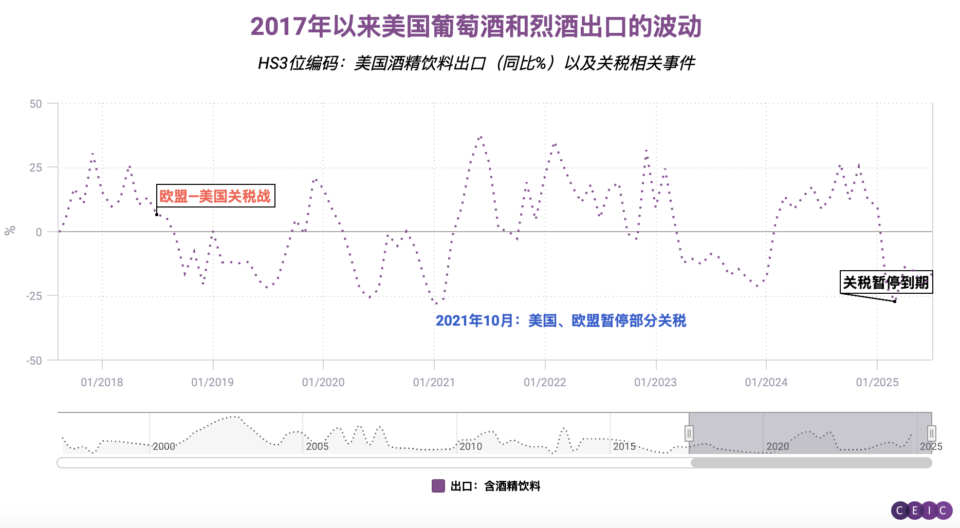 以下图表追踪了特朗普首个任期内美国酒类出口的起伏,并标注了关税实施与取消的关键节点。2022年10月美欧会谈达成协议,欧盟暂停征收报复性关税至2025年3月,推动2024年美国酒精饮料出口显著增长。(而2025年出口量下滑可能因高基数效应而被放大。)