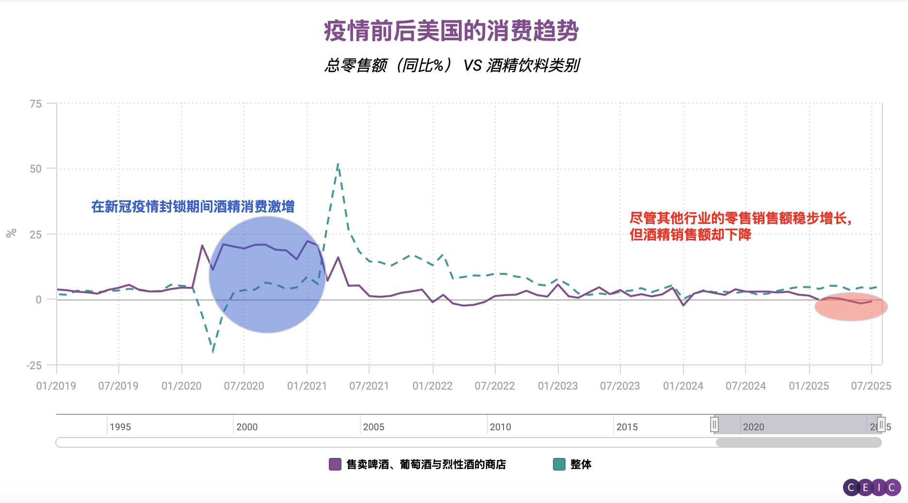 国内消费者也未能给啤酒商与蒸馏酒生产商带来太多缓解,因为美国年轻群体的酒精消费量低于老一辈。酒精饮料的上一个黄金时期是疫情间的报复性消费热潮。自2025年初以来,酒精饮料零售额持续下滑,与其他消费领域的趋势形成反差。