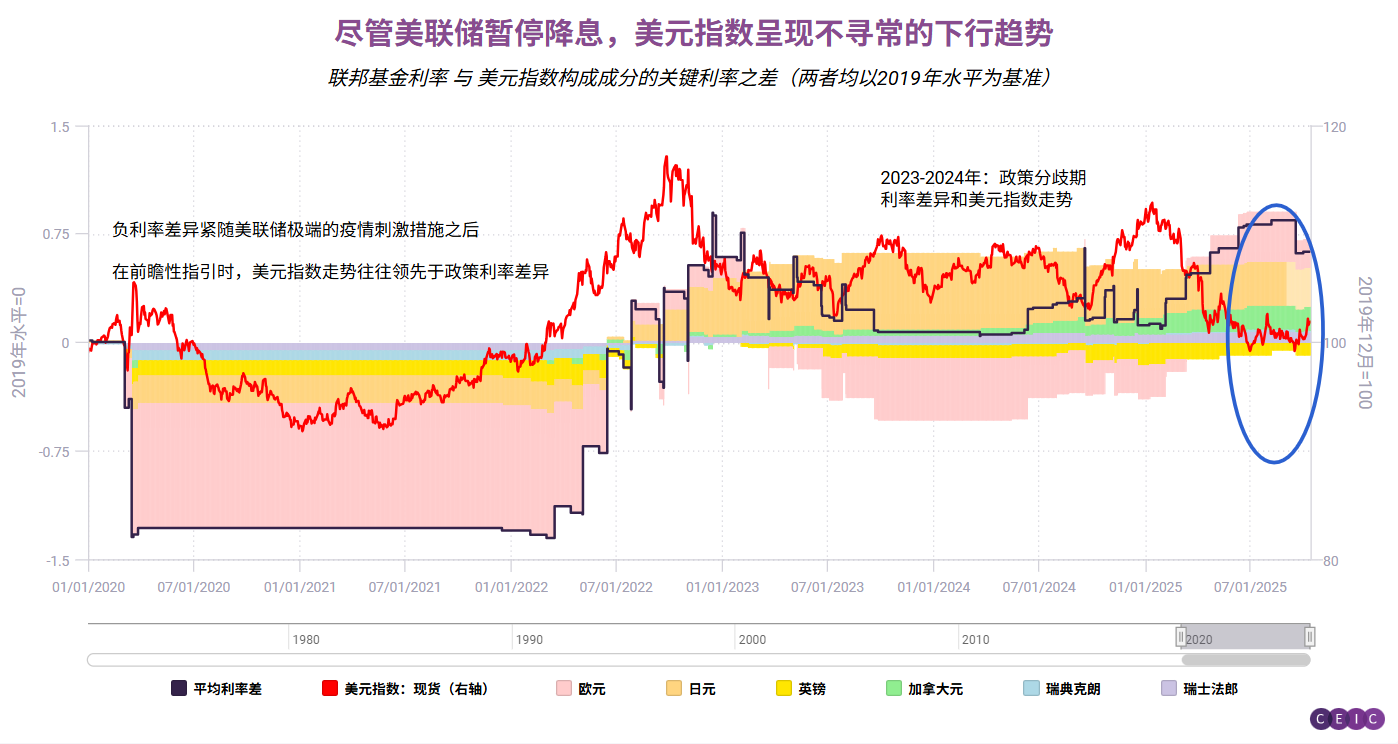 尽管美联储2025年顶住特朗普压力暂缓宽松(此举令特朗普不满),而美国多数主要贸易伙伴已开启降息周期,但受外部不确定性影响,美元指数已偏离其与他国政策利差间的通常关联模式。