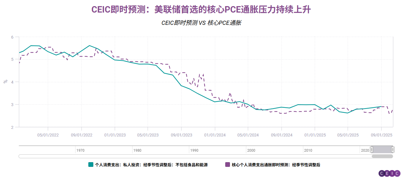 CEIC的通胀即时预测模型表明显著风险依然存在:核心个人消费支出(PCE)通胀正呈现上升趋势。